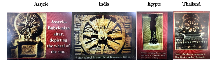 Our ancestors didn't just bring architecture with them when they migrated from Babylon. We also find shared symbols scattered across the globe. A striking example of this is the "sun wheel." Sun worship and the worship of other nature gods formed the heart of many pagan religions. Here you see the sun wheel in various versions.