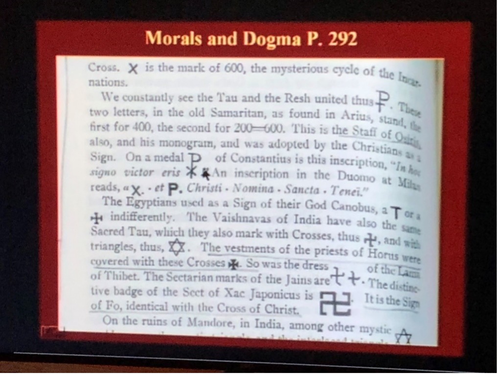 Here is a snapshot from his book in which he explains the esoteric meaning and history of various symbols.